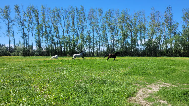 Sortie paddock en herbe + grand pré en herbe de 7000m2 suivant la météo.
